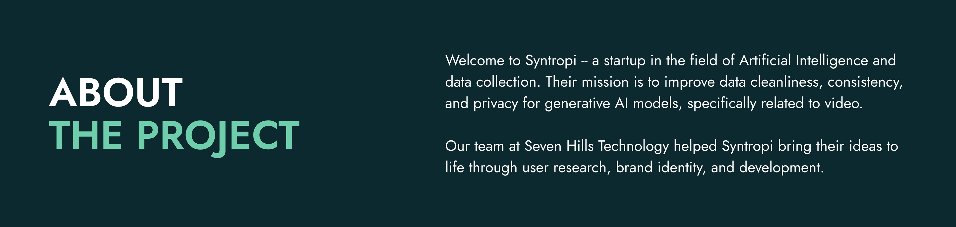 Syntropi is a startup in the field of Artificial Intelligence and data collection. Their mission is to improve data cleanliness, consistency, and privacy for generative AI models, specifically related to video.